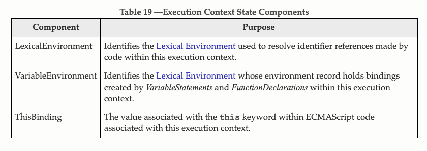 실행 컨텍스트가 생성될 때 VriableEnvironment(이하 V.E)에 정보를 먼저 담고 나서, 이를 그대로 복사하여 LexicalEnviroment(이하 L.E)를 구성한다. 초기 상태에서는 V.E 와 L.E가 동일하지만, 이후 코드 진행에 따라 서로가 달라질 수 있다.(라고는 하지만 V.E에 대한 설명이 부족한 편이라 이해하기 어려웠다. ECMA 공식 문서에 의하면 아래의 내용을 확인할 수 있다)