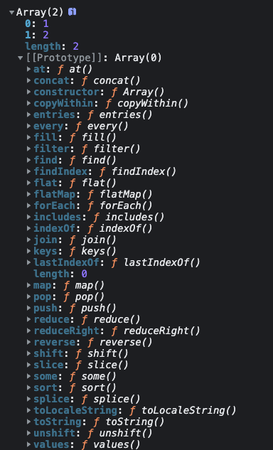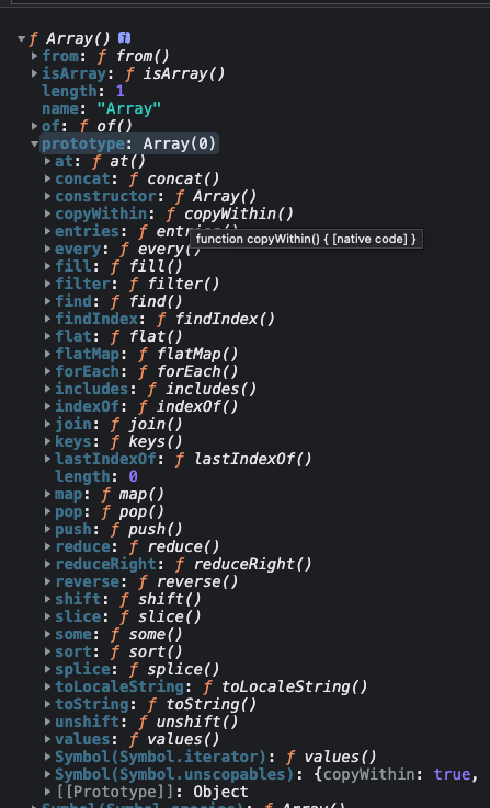arr에 Array의 프로토타입에 정의된 배열의 기본 메서드가 잘 복제된 것을 확인할 수 있다. 배열을 할당하기만 해도 인스턴스가 만들어진 것이다. 그리고 더 살펴보면, from이나 isArray는 프로토타입 밖에 정의되어 있기 때문에 인스턴스가 참조할 수 없음을 확인할 수 있다. 이렇게 프로퍼티에 정의되지 않아 인스턴스가 참조할 수 없는 메서드나 속성을 각각 스태틱 메서드, 스태틱 프로퍼티라고 부른다.